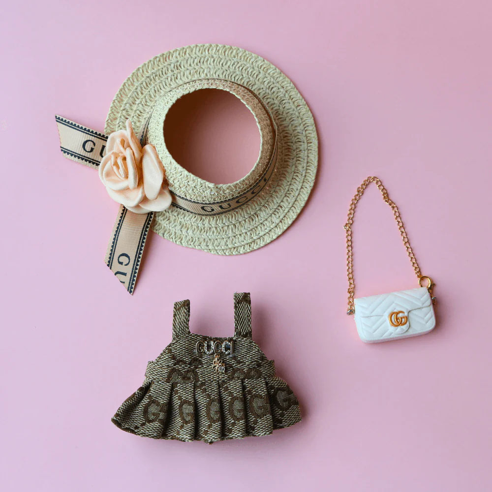 Vintage Bloom GG Look Dress, Hat & C-Bag 3-Piece Set - Labubu Fashion Clothes (Bag Included)